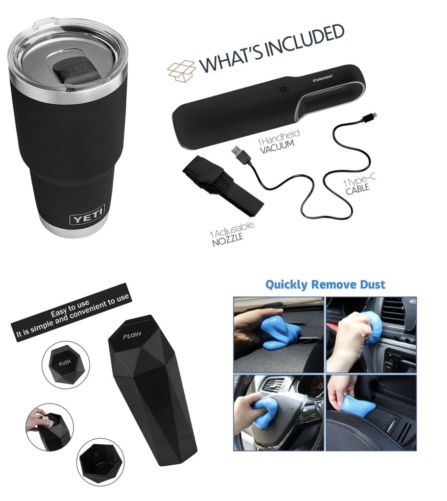 Keeping your car clean is an important part of maintaining its value and ensuring that it remains in good condition over time. A clean car not only looks great, but it can also help to prevent damage and wear and tear that can occur from exposure to dirt, grime, and other debris. A few things that might help keep a clean car: a handheld vacuum, trash can, dust collector, and for fun a Yeti that fits in your cup holder.
